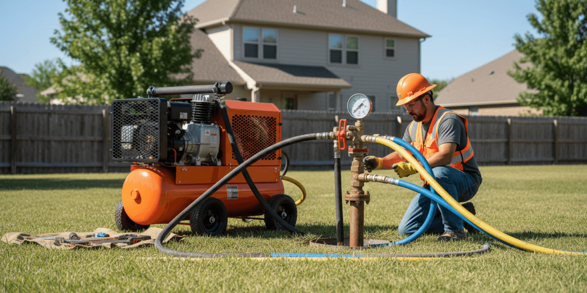 Для самостоятельной продувки скважины потребуется компрессор с рабочим давлением не менее 12 атмосфер. В процессе работы воздух нагнетается в ствол под давлением до 15 атм — бытовые автомобильные насосы для этого не подходят. Помимо компрессора, понадобятся: армированный шланг подходящего диаметра, переходники для герметичного подключения к устью скважины и ёмкость для сбора грязной воды на поверхности.